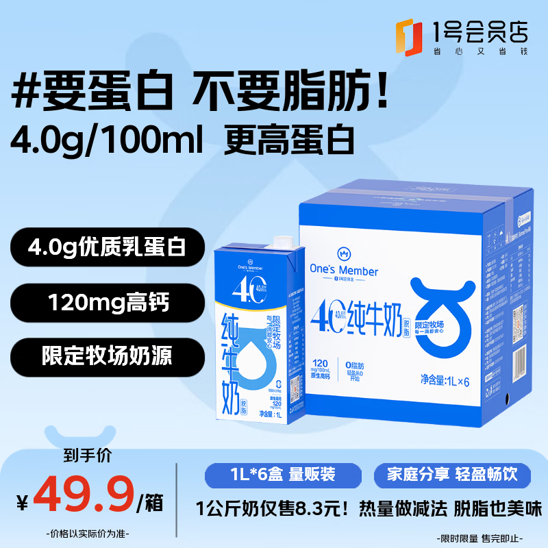 1号会员店4.0蛋白脱脂奶1L*6盒 0脂肪减脂健身整箱 超值囤货装